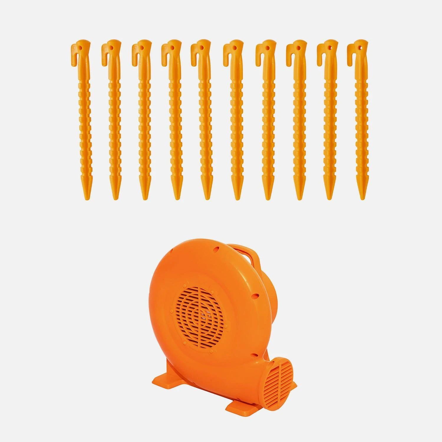 Fabriqué en PVC, le château gonflable Belcastel est très robuste et résiste dans le temps.Vos enfants vont adorer faire la course sur le toboggan 2 voies ou jouer au basket au dessus du tunnel grâce au panier de basket et au ballon inclus. Le distributeur d’eau permet de maintenir le tapis glissant.