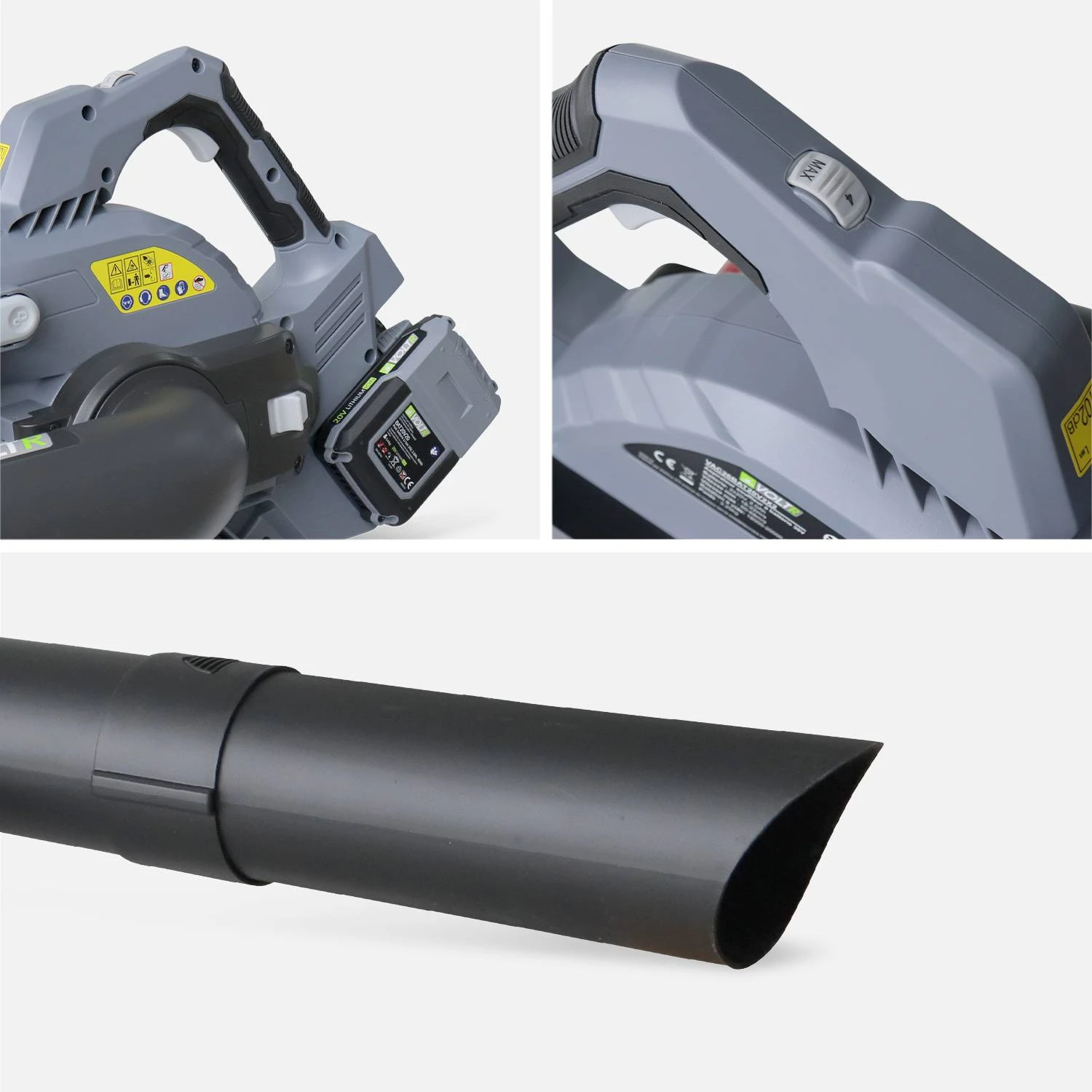 Les batteries sont fabriquées à partir de composants Lithium-Ion. C’est un gage de longévité et de qualité. En effet, les batteries Li-Ion apportent une puissance immédiate et continue, sans faiblir. Lorsque les batteries sont déchargées, l’aspirateur-souffleur s’arrêtera directement, sans signes de faiblesse au préalable. Le double accumulateur est équipé d’un témoin LED qui permet de connaitre le niveau de charge de la batterie, à tout moment. Autre avantage de ce type de batteries, elles peuvent se recharger n’importe quand car il n’est pas utile d’attendre qu’elles soient vidées entièrement. La batterie est compatible avec les autres appareils 20V de la marque VOLTR. Avant la première utilisation, il faudra recharger complètement, une première fois, la batterie.