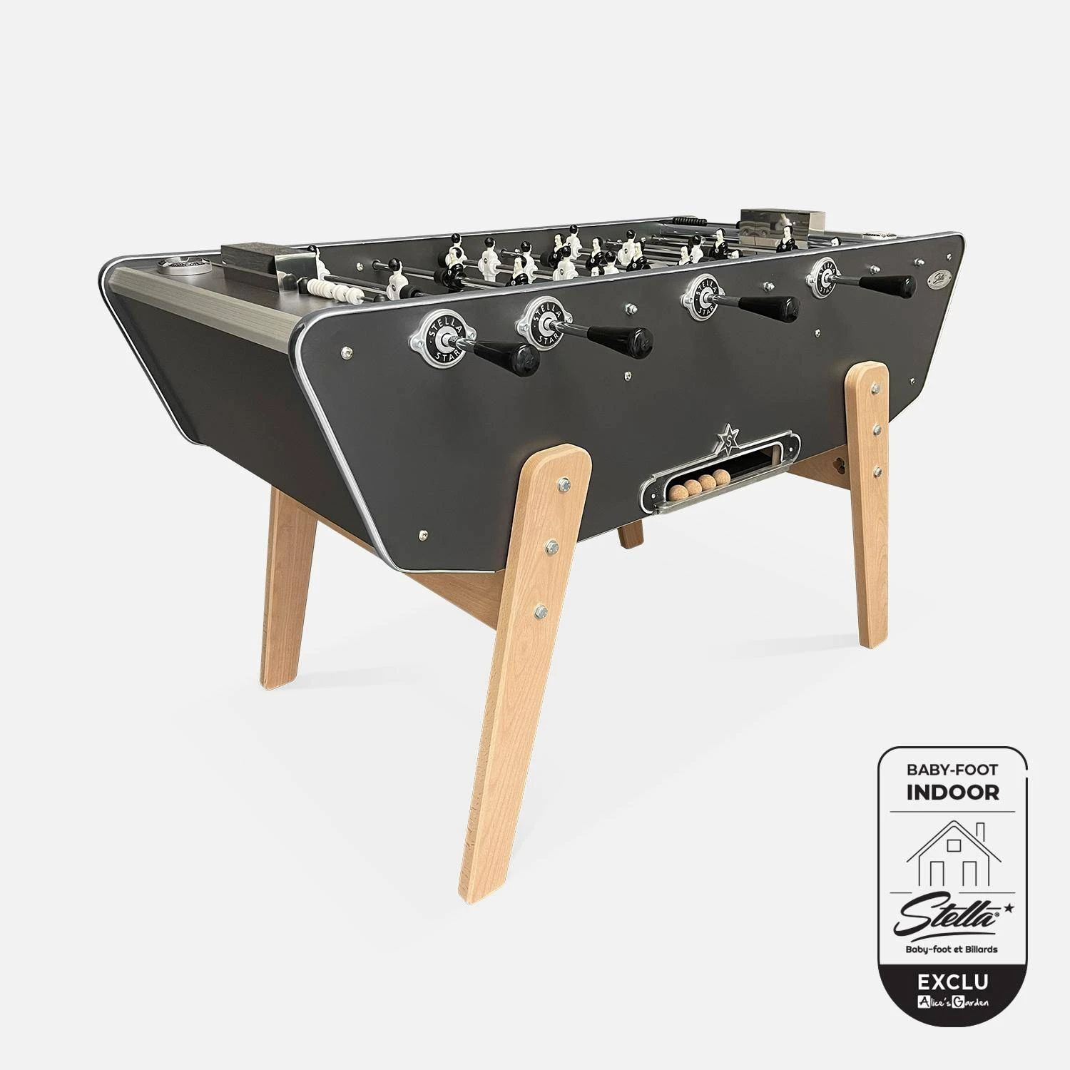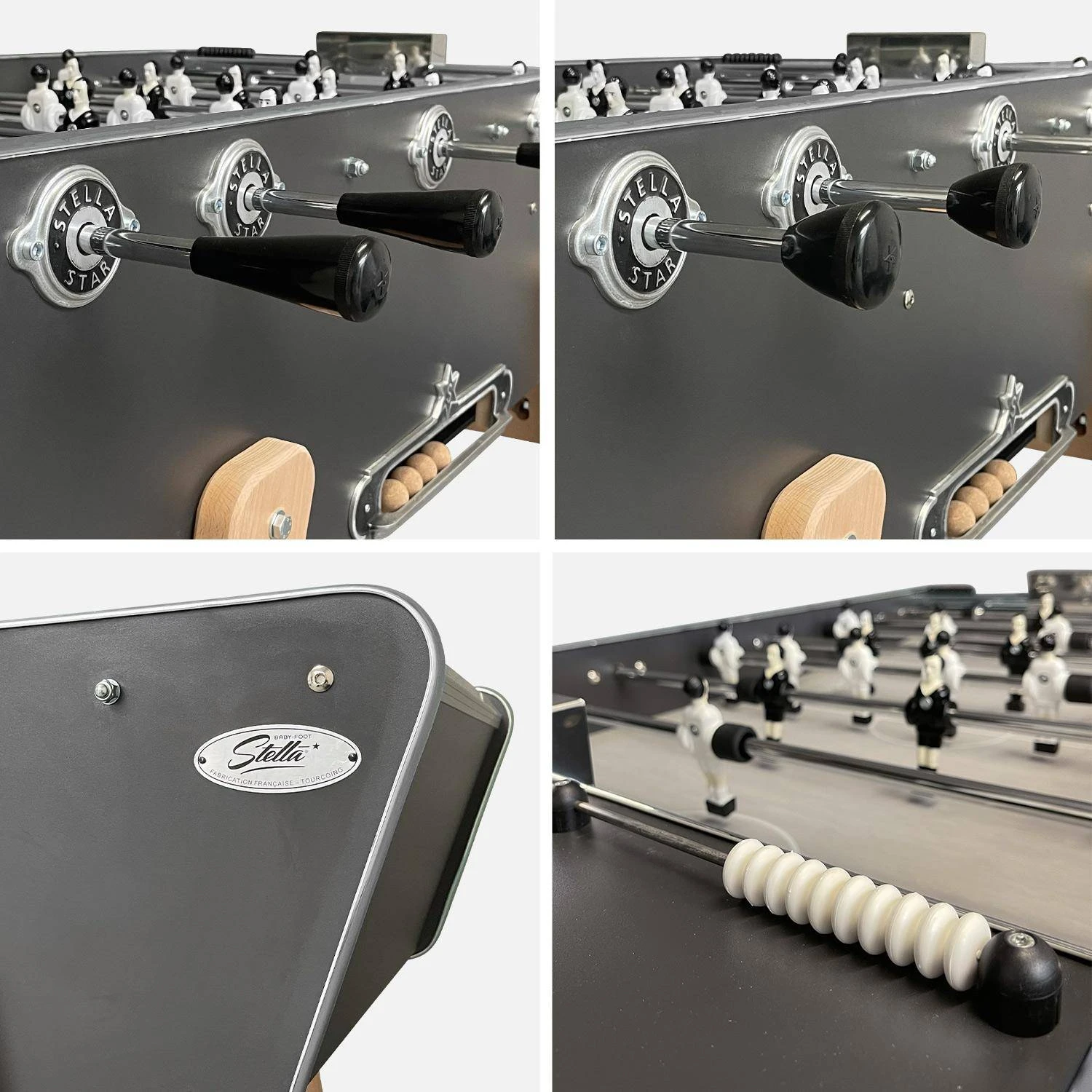 La caisse est en bois mélaminé gris anthracite, ses pieds en hêtre massifs, les couvres chant sont en chrome brillant et les barres télescopiques en acier 15mm seront à la hauteur pour vos parties. Les buts sont en inox et les amortisseurs en caoutchouc.