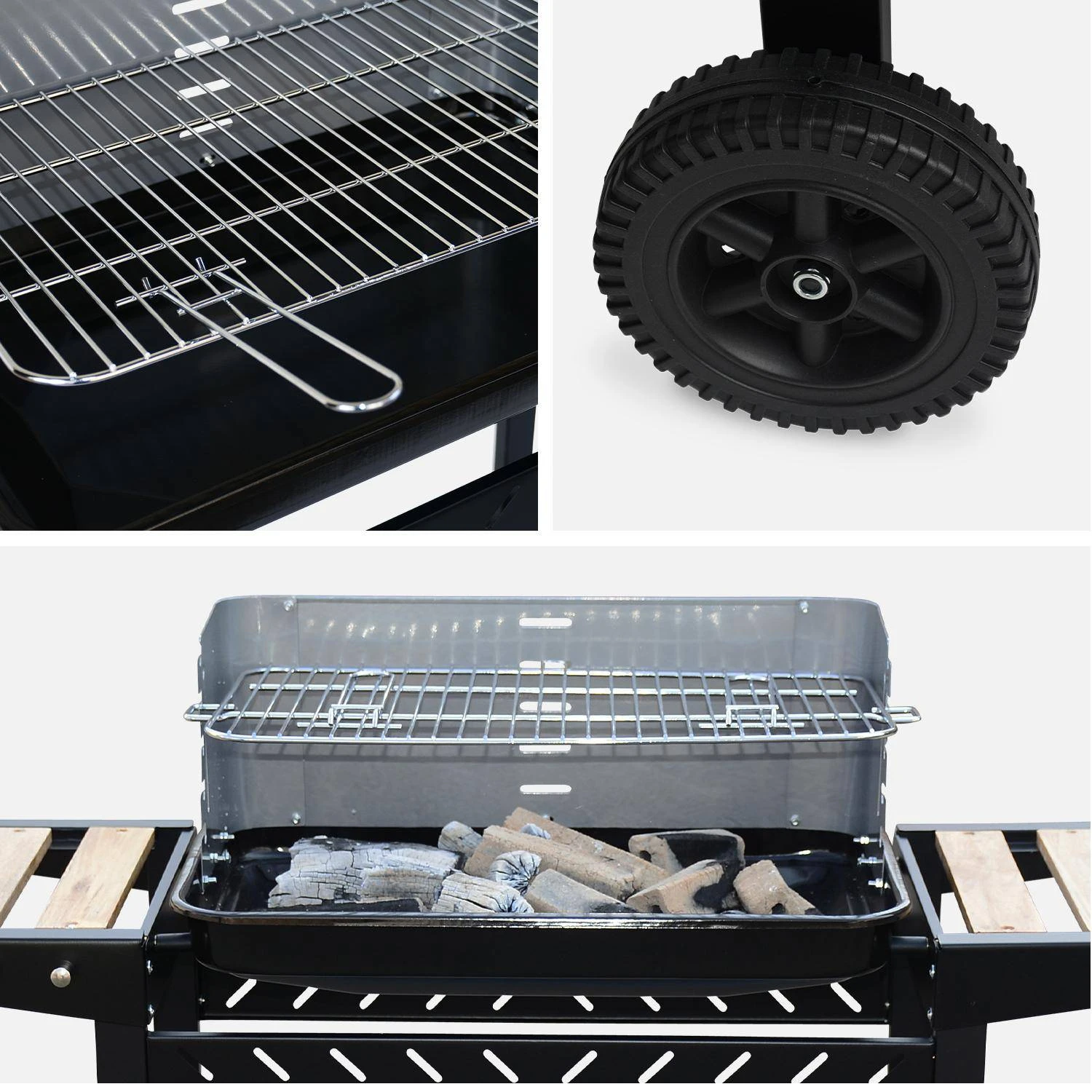 Ce barbecue à charbon possède deux tablettes en bois latérales et une étagère en bas. C’est pratique pour poser plats, ustensiles et condiments. L’une des tablettes est munie de crochets pour vos torchons, par exemple.