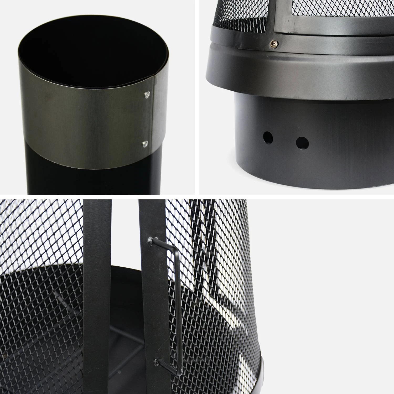 Grâce à une porte d’accès en façade, il est simple d’ajouter ou de manipuler le bois dans le foyer, à l’aide du tisonnier fourni. Ce braséro est en acier recouvert d’une jolie peinture noire, résistante à la chaleur. Les grilles qui entourent le foyer permettent de diffuser la chaleur tout autour de lui. La grille placée en bas du foyer, quant à elle, évite aux braises de s’étouffer avec les cendres. Le poêle de terrasse est sur une base dotée de 6 trous d’aération pour ventiler en dessous du foyer, et donc atténuer l’impact de la chaleur sur le sol pour préserver la pelouse ou la terrasse.
