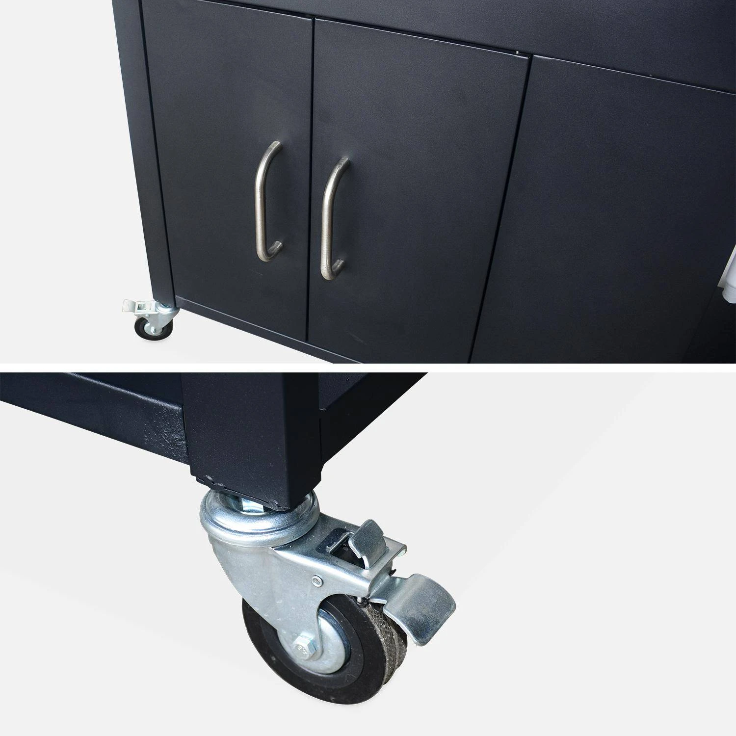 En plus de son beau design, cette cuisine se montre particulièrement fonctionnel grâce à ses nombreux espaces de rangements. Son placard vous permettra de ranger plats et assiettes tandis que ses 6 crochets de part et d’autre de la desserte vous permettront d’y suspendre vos ustensiles. Une cuisine de barbecue pratique que vous pourrez déplacer facilement grâce à ses 4 roulettes.