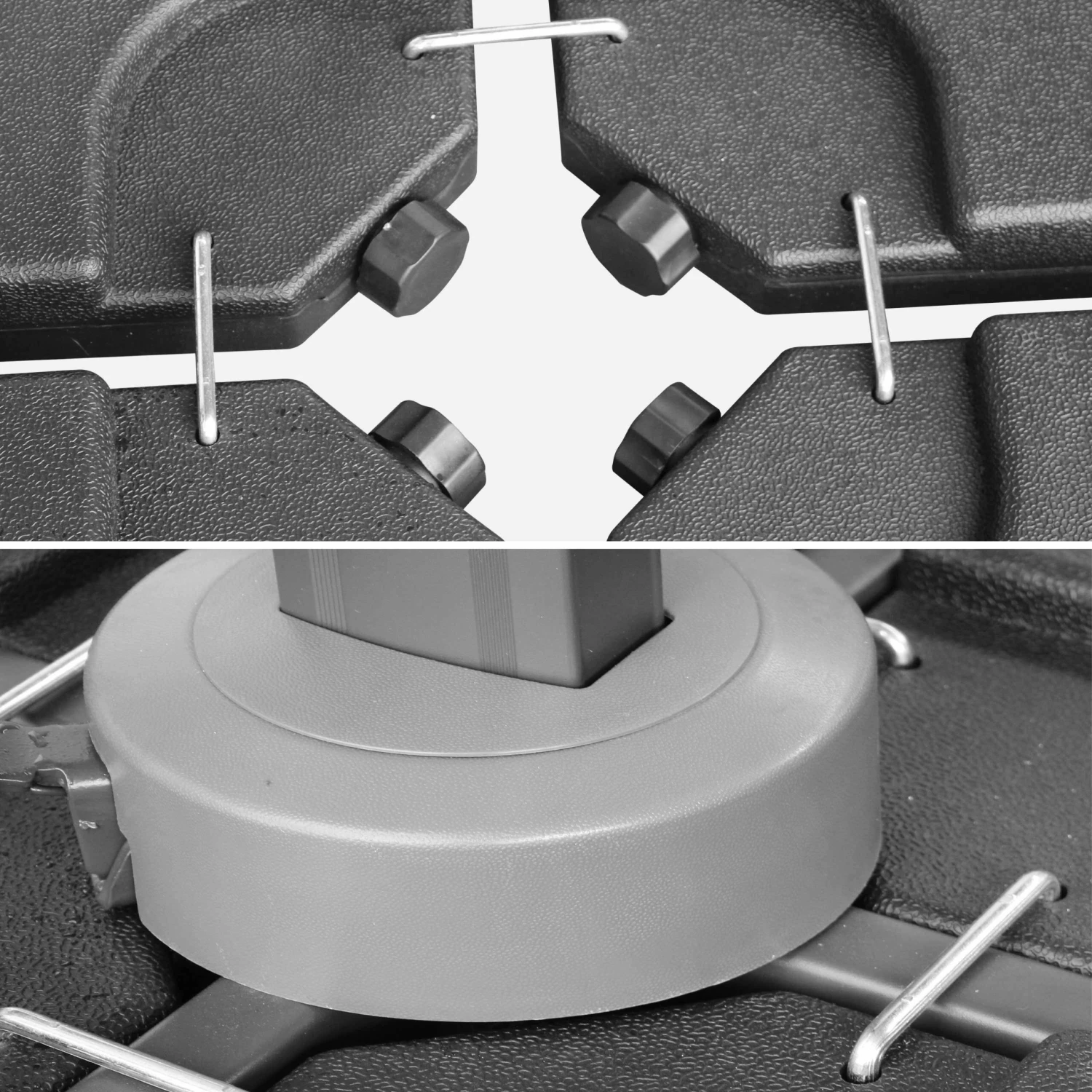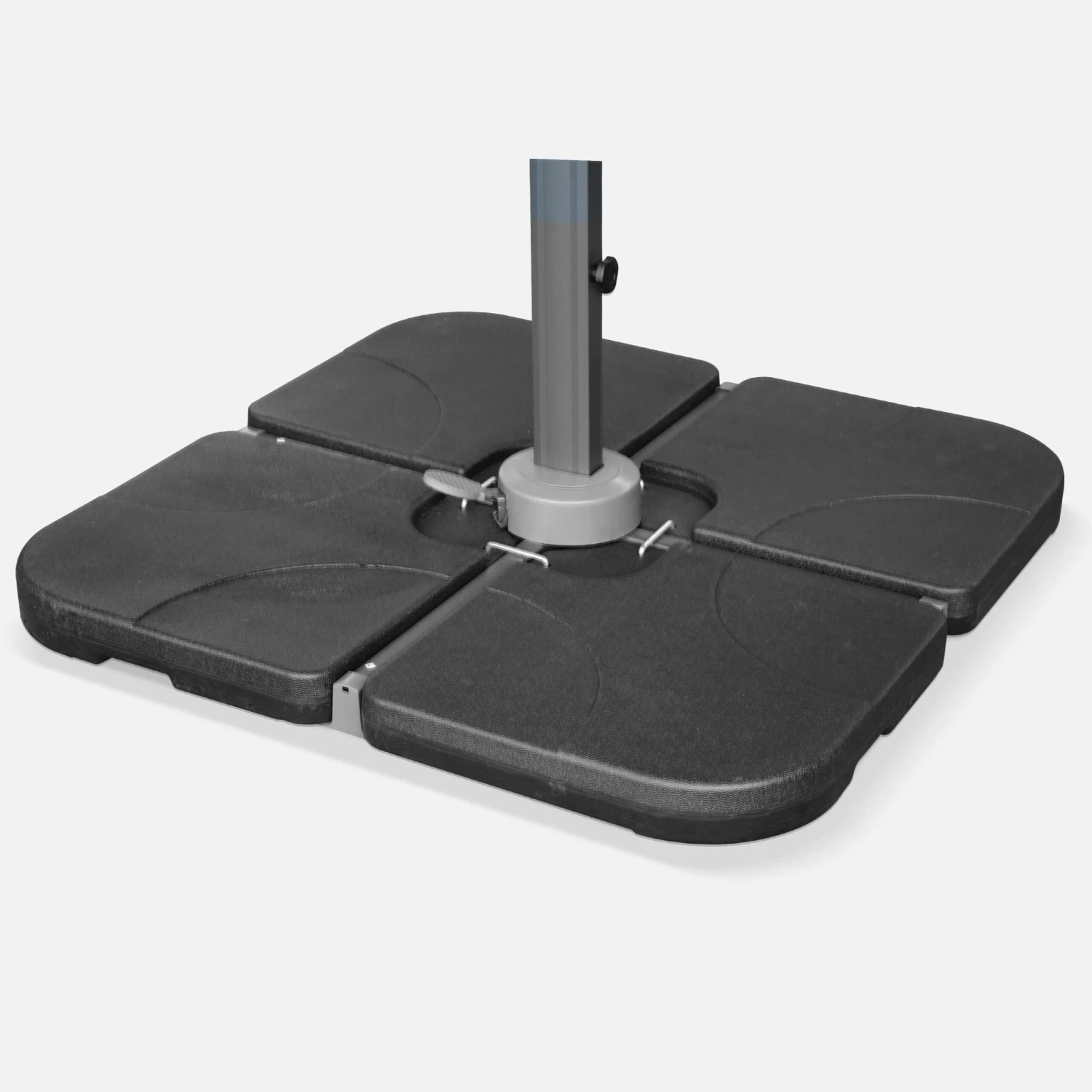 Ces dalles en plastique vous permettent de lester votre parasol déporté. Elles se remplissent de sable et sont résistantes aux chocs, aux intempéries et à l’usure. Quatre petits crochets métalliques sont fournis avec les dalles pour les maintenir ensemble.