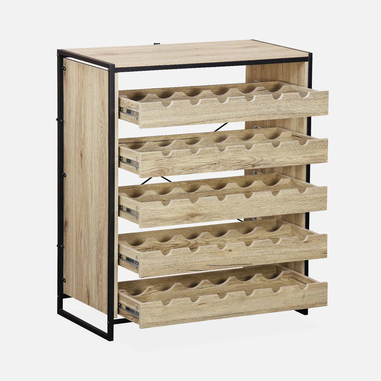 Equipé de 5 tiroirs, vous disposerez de 5 espaces de rangement qui eux-mêmes pourrons contenir 30 bouteilles au total ! Grâce à ses 6 emplacements par niveaux vous pourrez facilement trier vos bouteilles selon divers critères : anciennetés ou catégories : vins rouges, vins blancs, champagnes… Ce meuble très fonctionnel et pratique vous permettra de trouver plus facilement vos bouteilles lors de vos soirées entre amis ou lors d’occasions particulières.