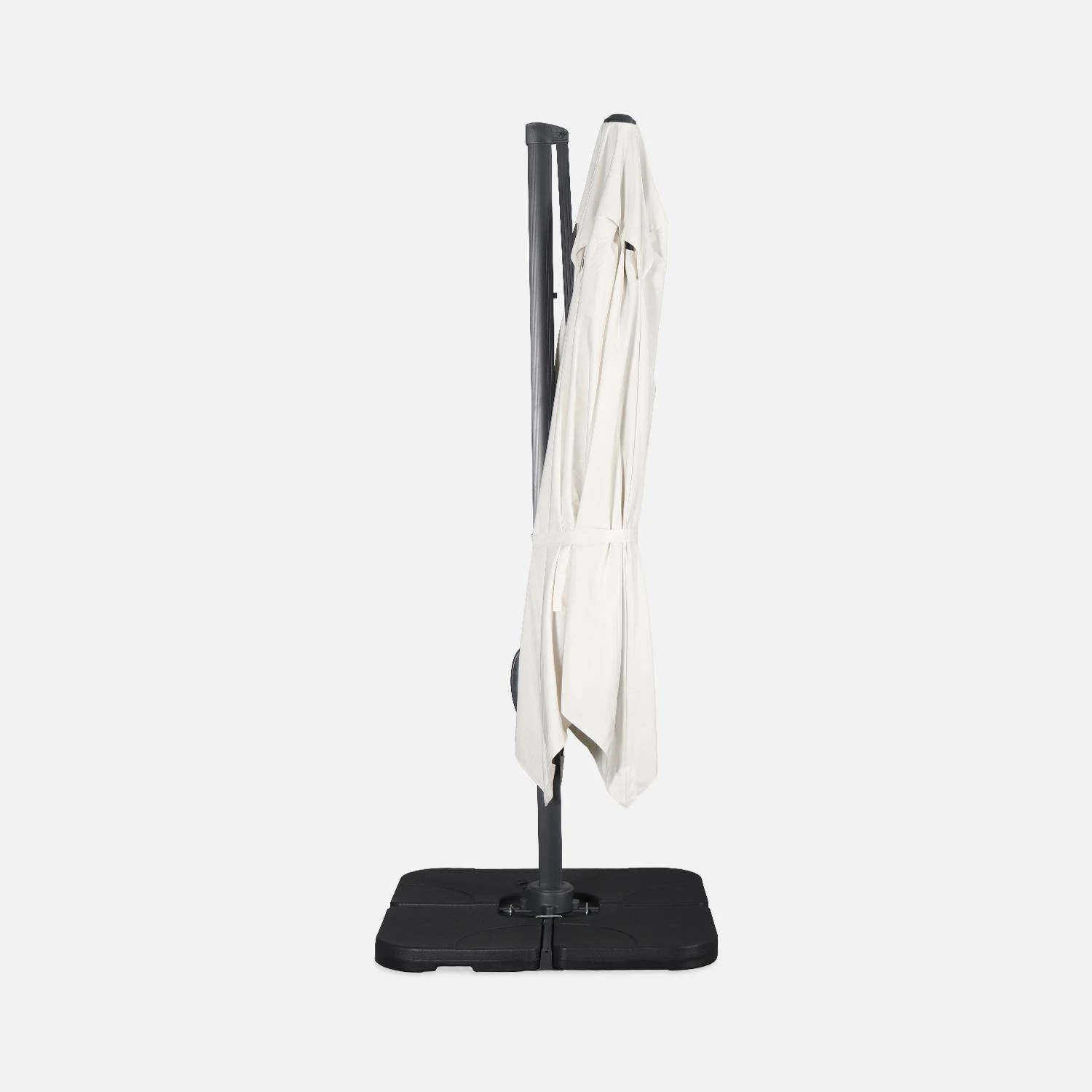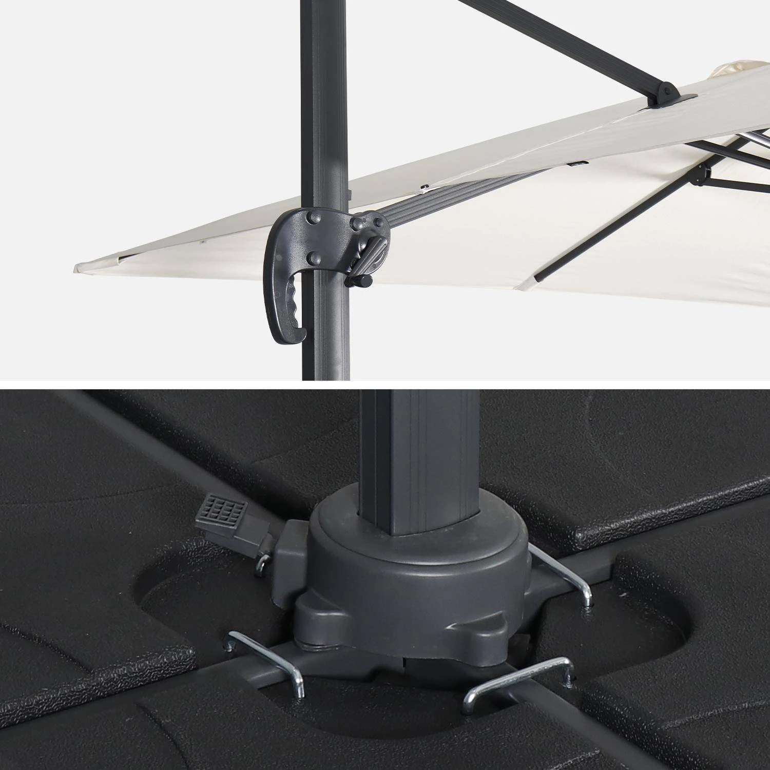 Attention, les dalles nécessaires pour lester le parasol ne sont pas fournies, vous retrouverez une sélection de dalles dans notre boutique (remplissable ou en résine). Vous pourrez trouver également des lests spéciaux en béton (de 40x40cm à 50x50cm), dans les grandes surfaces de bricolage.