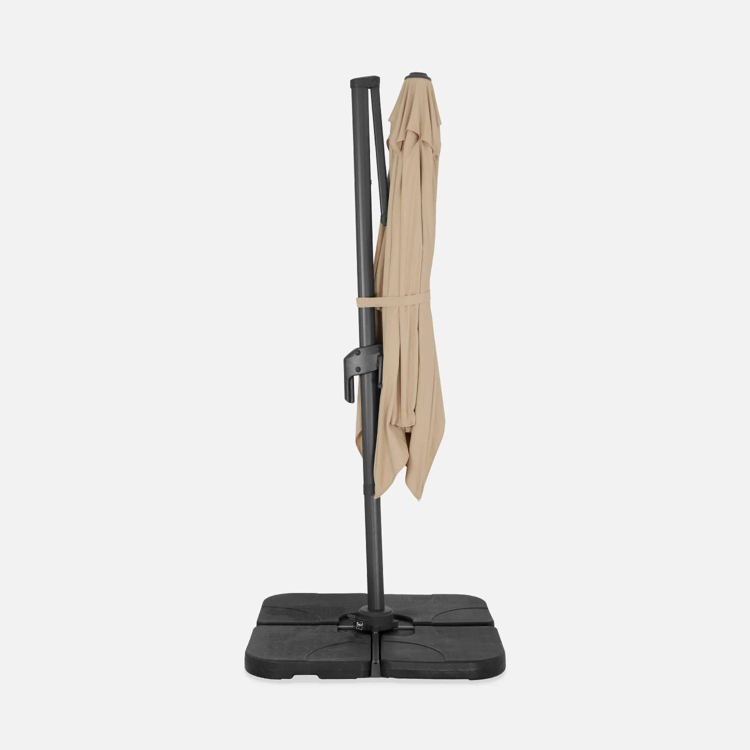 Attention, les dalles nécessaires pour lester le parasol ne sont pas fournies, vous retrouverez une sélection de dalles dans notre boutique (remplissables ou en résine). Vous pourrez également trouver des lests spéciaux en béton (de 40x40cm à 50x50cm), dans les grandes surfaces de bricolage.