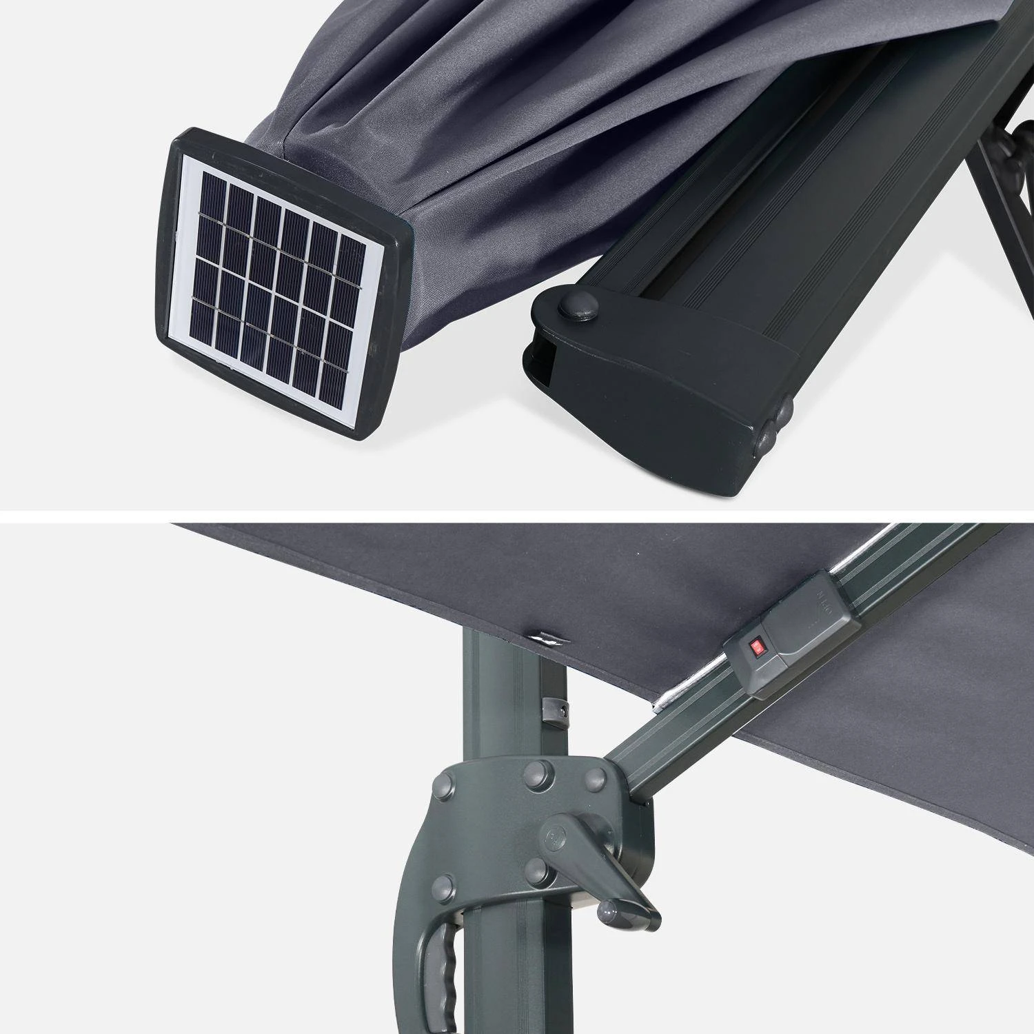 Le système LED est parfaitement intégré au Luce, aucun fil n’est apparent. Il est composé d’un chargeur solaire situé sur le sommet du parasol et d’une télécommande filaire en bout d’une baleine, avec recharge possible par transformateur secteur. Les bandes LED et batteries sont remplaçables et le module solaire se démonte facilement.