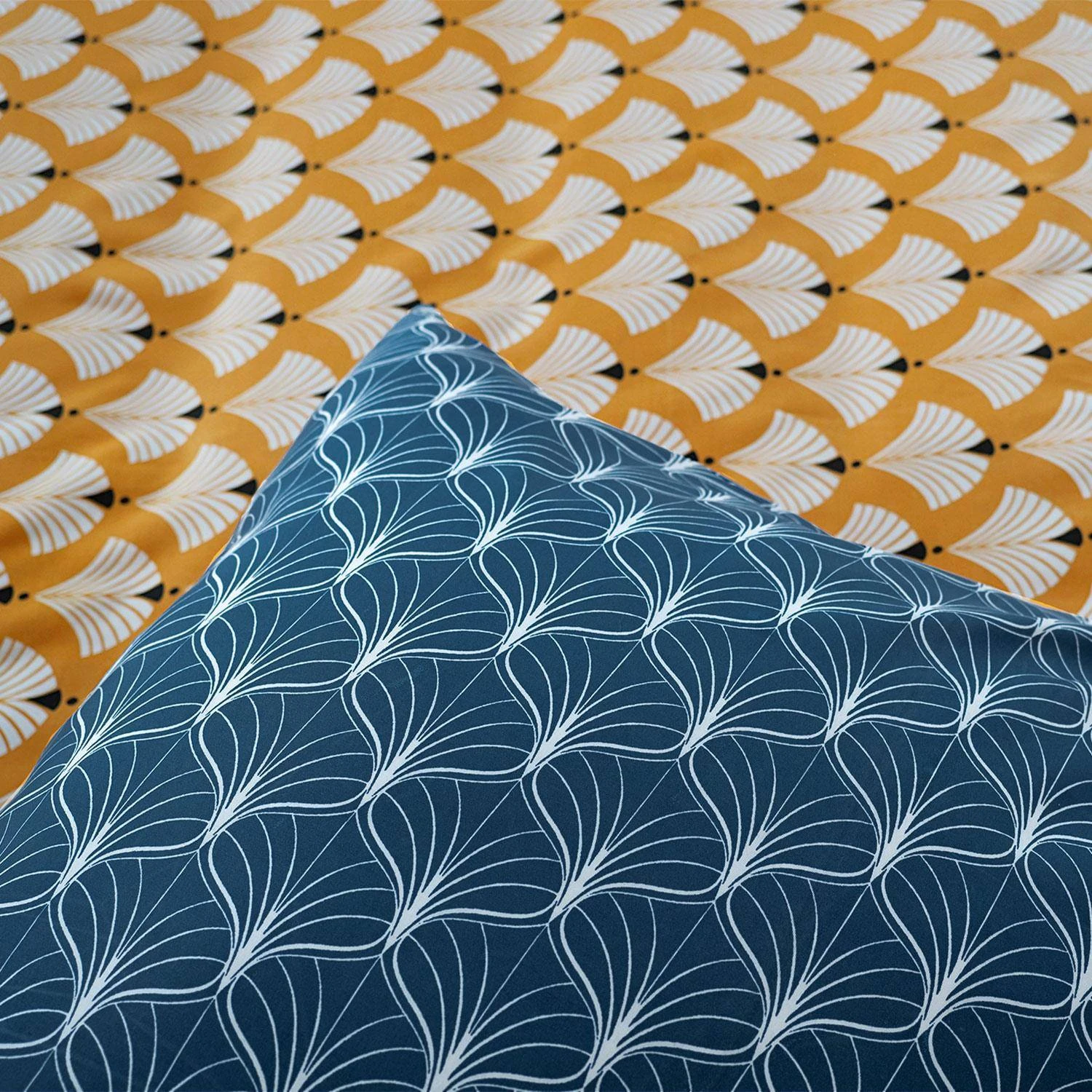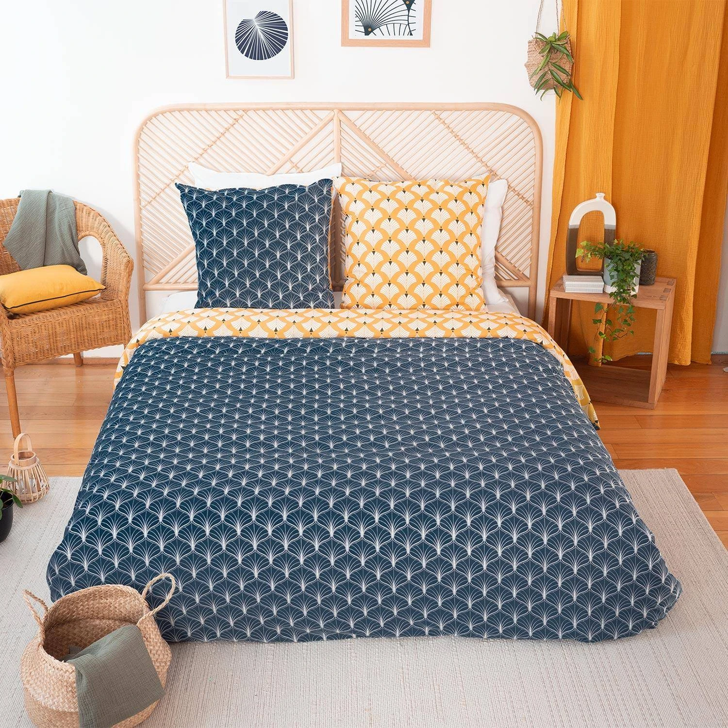 Habillez votre lit avec cette jolie parure de lit au motif fleurs de lotus. Réversible, vous pourrez choisir entre son côté jaune ou bleu selon vos envies.