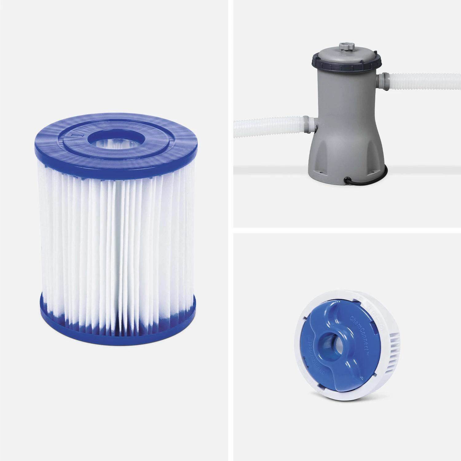 La piscine se monte en 30 minutes et est livrée avec une pompe de filtration de 2006L/h, un filtre à cartouche, un diffuseur et une échelle 4 échelons. Les parois intérieures quant à elles ont un aspect mosaïque.