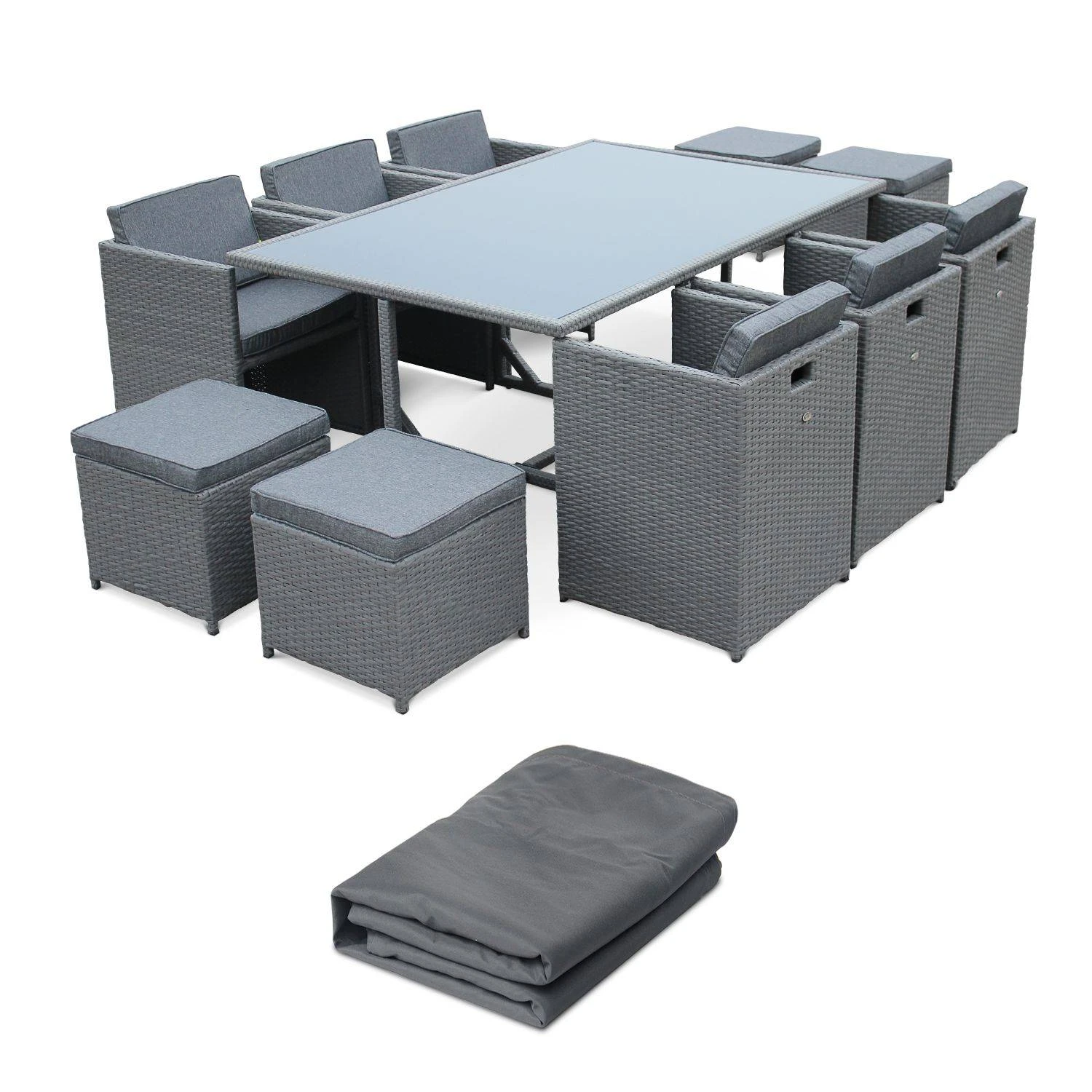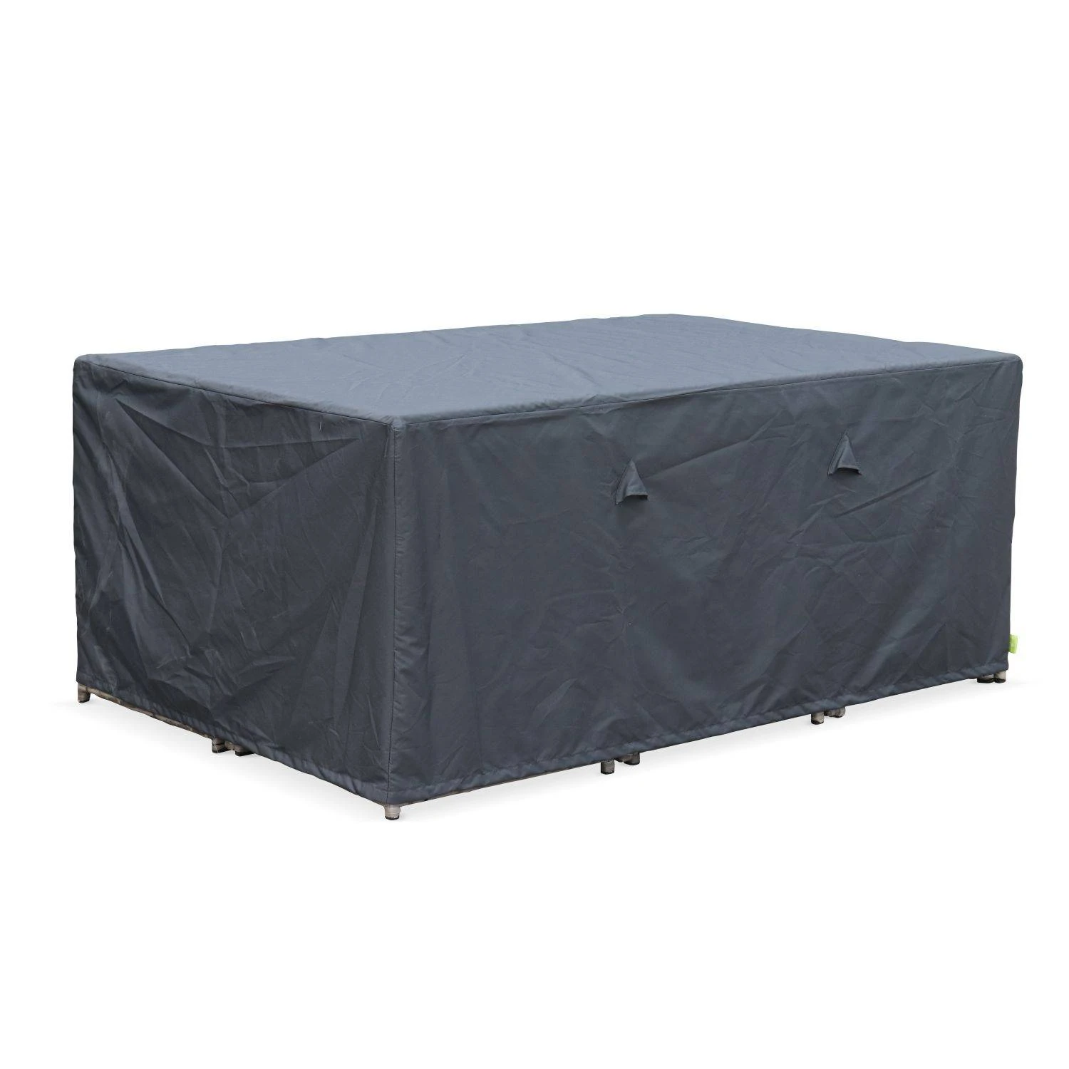 La housse fournie est en polyester avec un revêtement en polyamide. Déperlante et imperméable grâce à l’enduction PA, elle préserve votre ensemble de jardin de la pluie, de la poussière et du soleil. Cela évite l’usure et les dégradations liées aux intempéries. Pratique, cette housse traitée anti UV est dotée d’un cordon de serrage avec œillets intégrés. Ce cordon est inséré dans l’ourlet et il ressort dans les angles, cela permet de maintenir la housse sur le salon de jardin. Quatre aérateurs placés sur la housse empêchent la condensation. L’air libre circule également par le bas. Ainsi, les risques de moisissures sont évités.