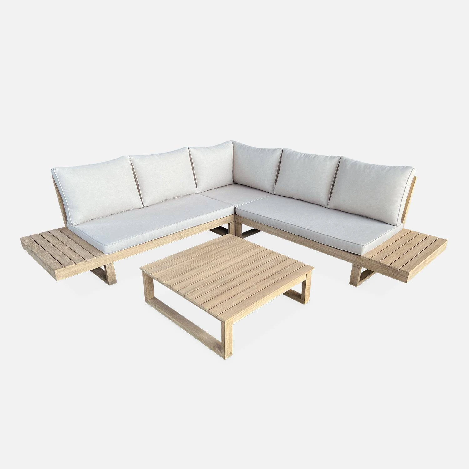 Entièrement fabriqué en bois d’acacia originaire du Vietnam, ce salon de jardin est robuste et durable. Dans une démarche plus écologique, nous avons opté pour un bois issu de plantation FSC. Le bois est brossé et possède un effet blanchi qui lui confère un aspect plus authentique. Pour s’adapter au mieux à vos besoins, les pieds de ce salon sont ajustables. Côté coussins, leur housse de haute qualité en polyester et leur épaisseur de 7 cm pour l’assise et de 19 cm pour le dossier, les rendent moelleux et propices à la détente ! Cerise sur le gâteau, les coussins sont déhoussables afin de faciliter leur entretien !