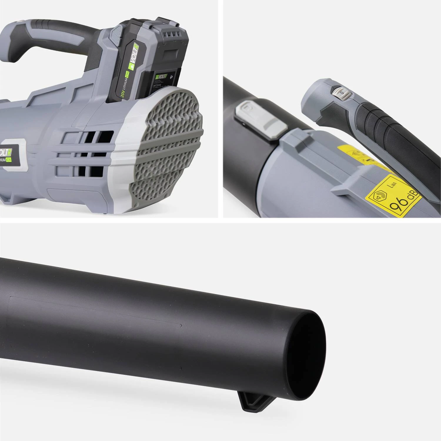 La batterie est fabriquée à partir de composants Lithium-Ion. C’est un gage de longévité et de qualité. En effet, les batteries Li-Ion apportent une puissance immédiate et continue, sans faiblir. Lorsque la batterie est déchargée, le souffleur s’arrêtera directement, sans signes de faiblesse au préalable. Alors, l’accumulateur est équipé d’un témoin LED qui permet de connaitre le niveau de charge de la batterie, à tout moment. Autre avantage de ce type de batteries, elles peuvent se recharger n’importe quand car il n’est pas utile d’attendre qu’elles soient vidées entièrement. La batterie est compatible avec les autres appareils 20V de la marque VOLTR. Avant la première utilisation, il faudra recharger complètement, une première fois, la batterie.