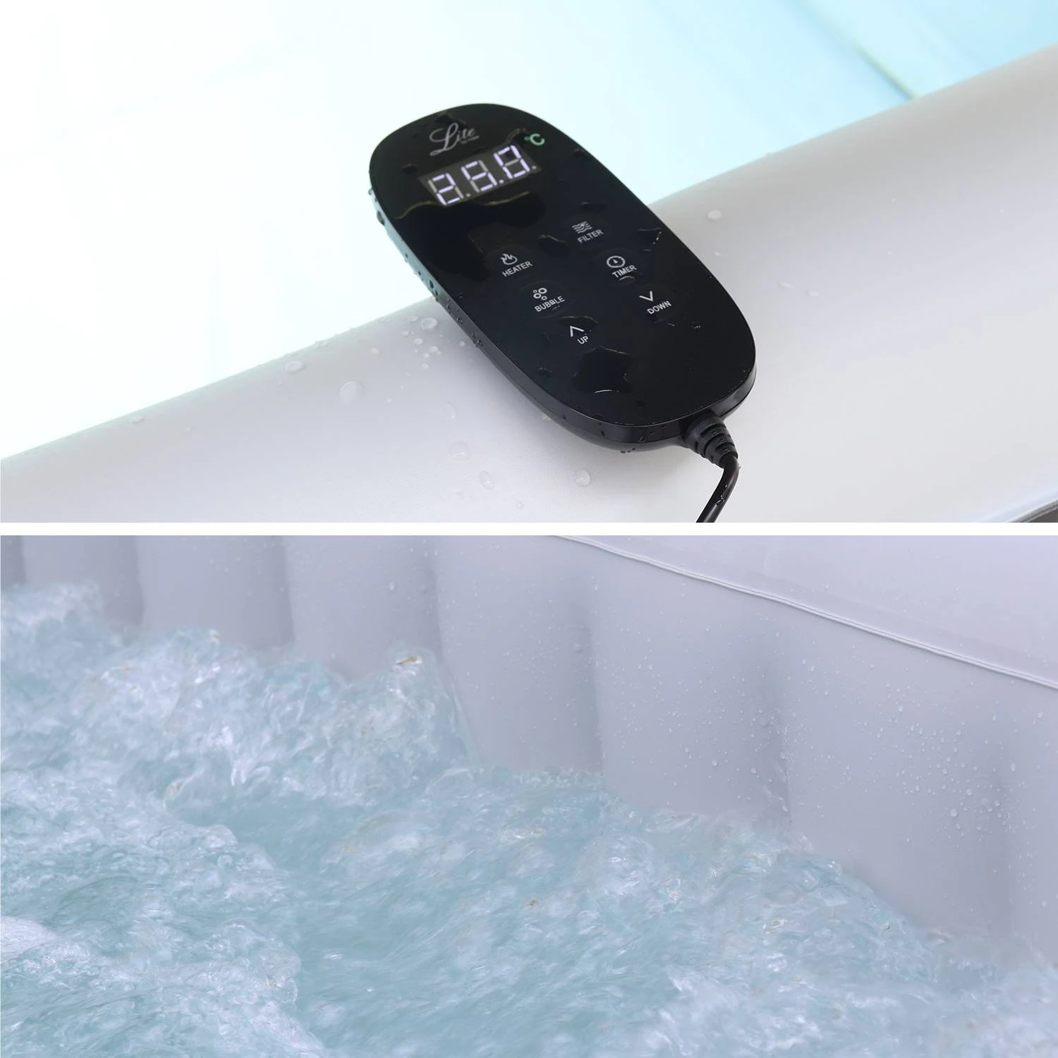 Ce spa est simple d’utilisation. La température, la mise en marche, la chauffe différée et les autres fonctionnalités se gèrent grâce à la télécommande filaire étanche. Le gonflage s’effectue par système intégré. Il suffit de brancher le spa, d’enclencher le mode gonflage et de presser une touche de la télécommande, rien de plus simple ! La mise en place est facile et ne nécessite pas d’outil. En 10 minutes, le spa est installé et prêt à accueillir de l’eau. Un système de vidange avec adaptateur pour tuyau d’arrosage permettra de vider votre spa proprement et sans effort.