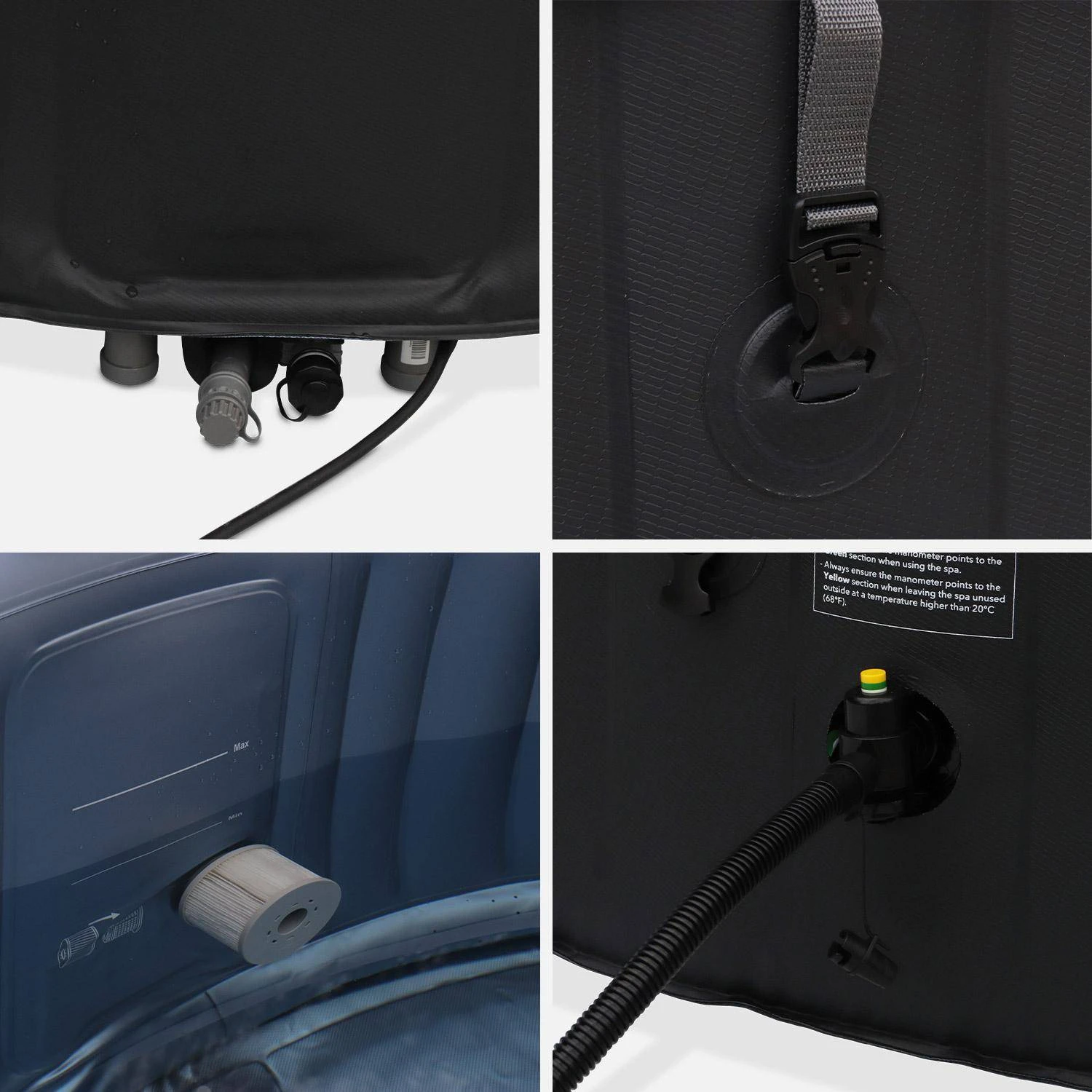 Ce spa s’utilise facilement. La télécommande filaire étanche permet de contrôler les différentes fonctionnalités comme la température, la mise en marche ou la chauffe différée. Pour le gonflage, qui fonctionne en système intégré, il faut simplement brancher le spa, enclencher le mode de gonflage et appuyer sur une touche de la télécommande. Vous n’aurez besoin d’aucun outil pour sa mise en place. En 10 minutes seulement, le spa est prêt à accueillir de l’eau. Pour vider votre spa proprement et sans effort, le spa est doté d’un système de vidange avec adaptateur. La bâche isotherme qui s’utilise comme couvercle se relie à la structure grâce aux clips.