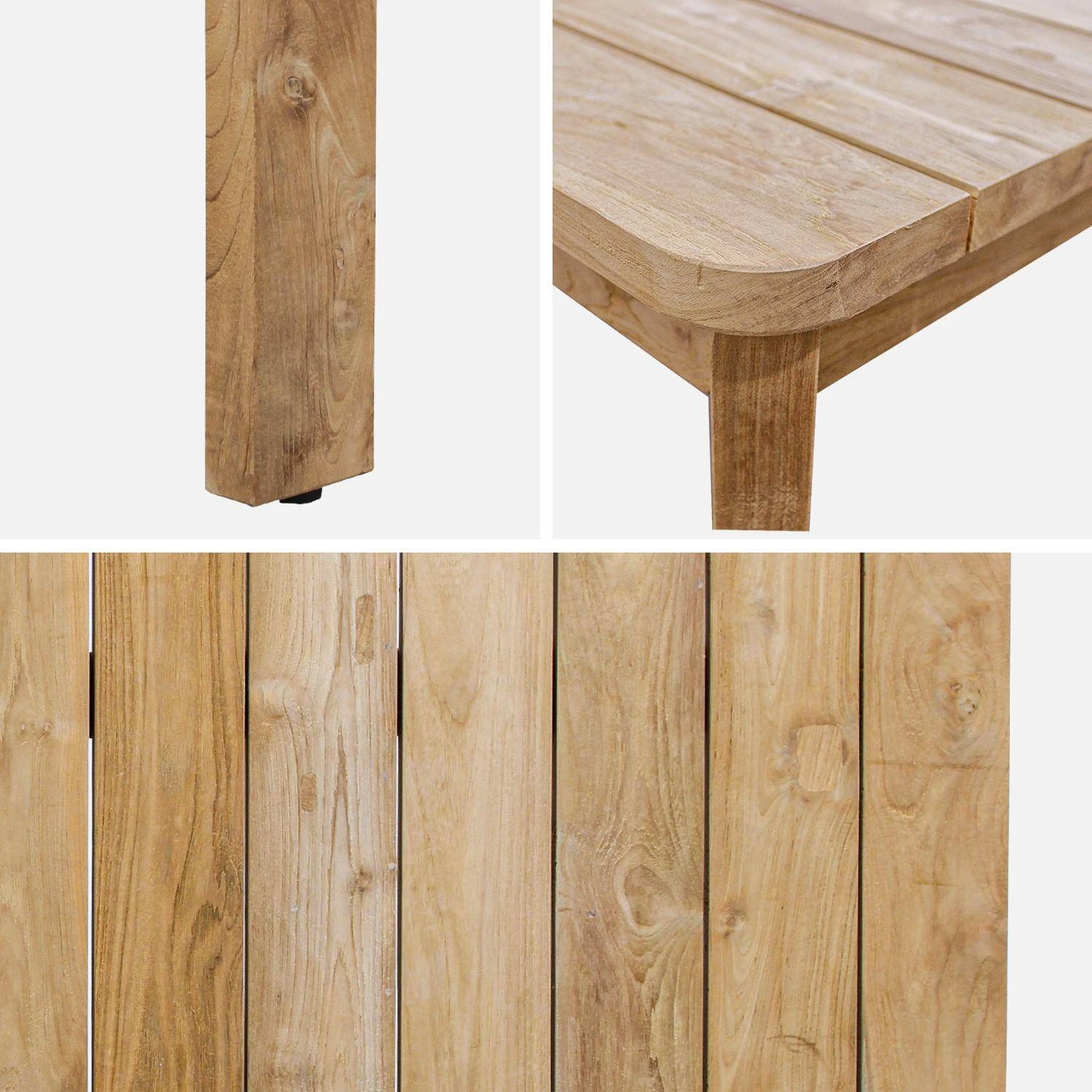 Le Teck est un bois tropical à croissance lente. Il faut 80 ans pour qu’un arbre arrive à maturité. C’est donc un bois rare et protégé. Le bois de teck est solide et très résistant. Bien entretenu, il peut conserver ses propriétés durant de très nombreuses années. Dans une démarche de préservation des forêts, le Teck recyclé est une alternative qui s’inscrit dans une démarche éco responsable. C’est un bois qui provient essentiellement de poutres, de bâtiments, de traverses de chemin de fer… Il permet d’éviter la coupe de milliers d’arbres chaque année. Le teck recyclé est retravaillé avant son utilisation pour la fabrication de meubles de jardin. Les trous sont rebouchés et le bois est poncé. Ces irrégularités témoignent de la vie passée du bois et révèlent toute la force et la durabilité de ce matériau. Ils rendent également chaque table en teck recyclé unique.