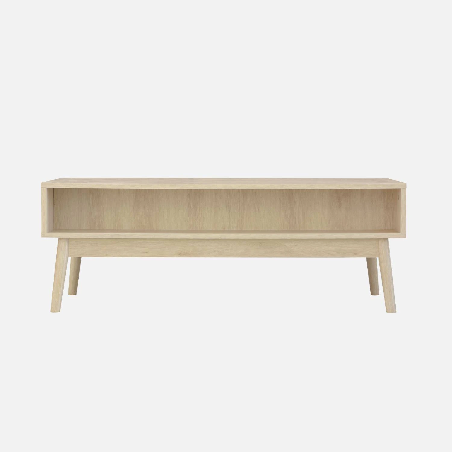 Cette table basse au design scandinave possède un charme sans pareil. Sa structure en décor bois lui donne un aspect naturel et tendance. Ses pieds bois en compas et ses détails rainurés sur son tiroir réversible lui apportent quant à eux, charme et authenticité. Parfaite dans une décoration contemporaine, elle habille élégamment votre pièce grâce à ses lignes fines.