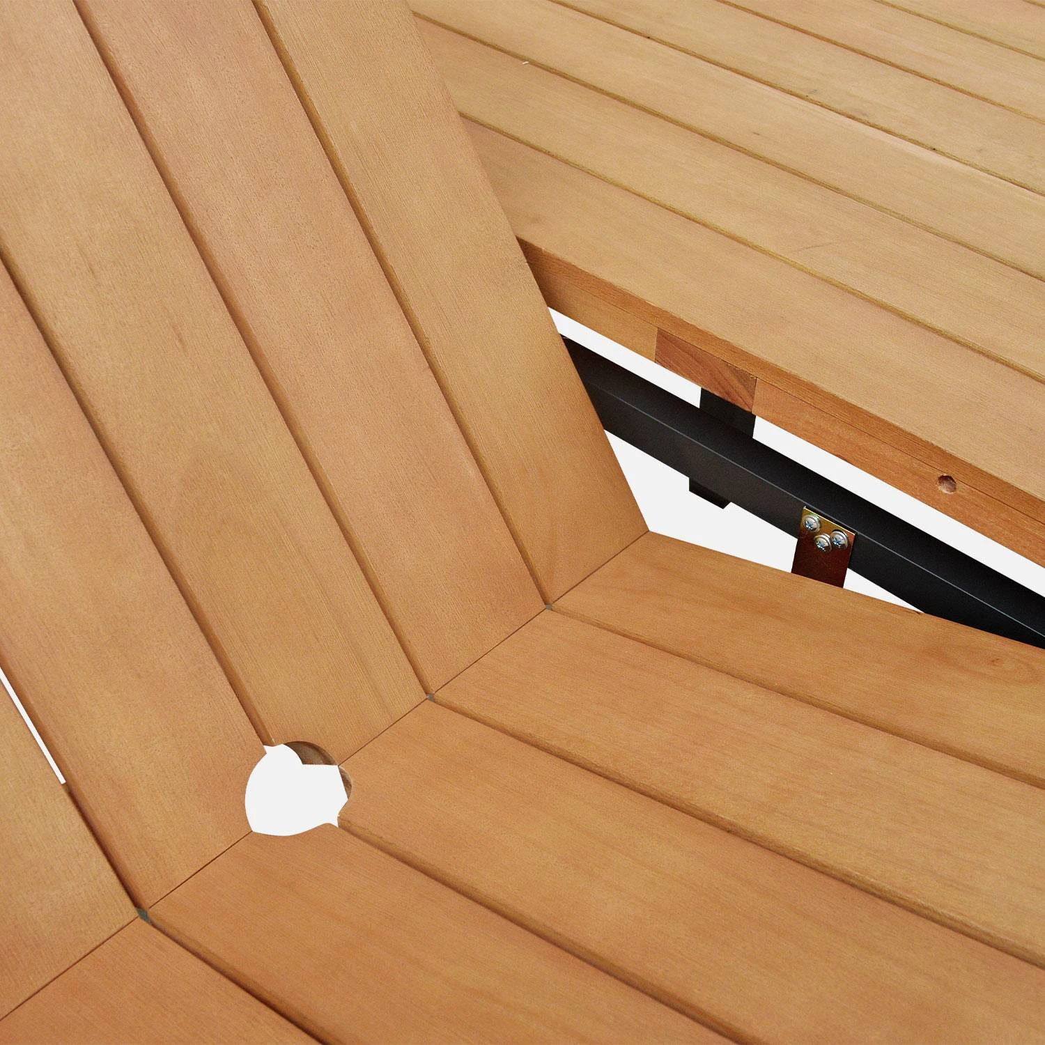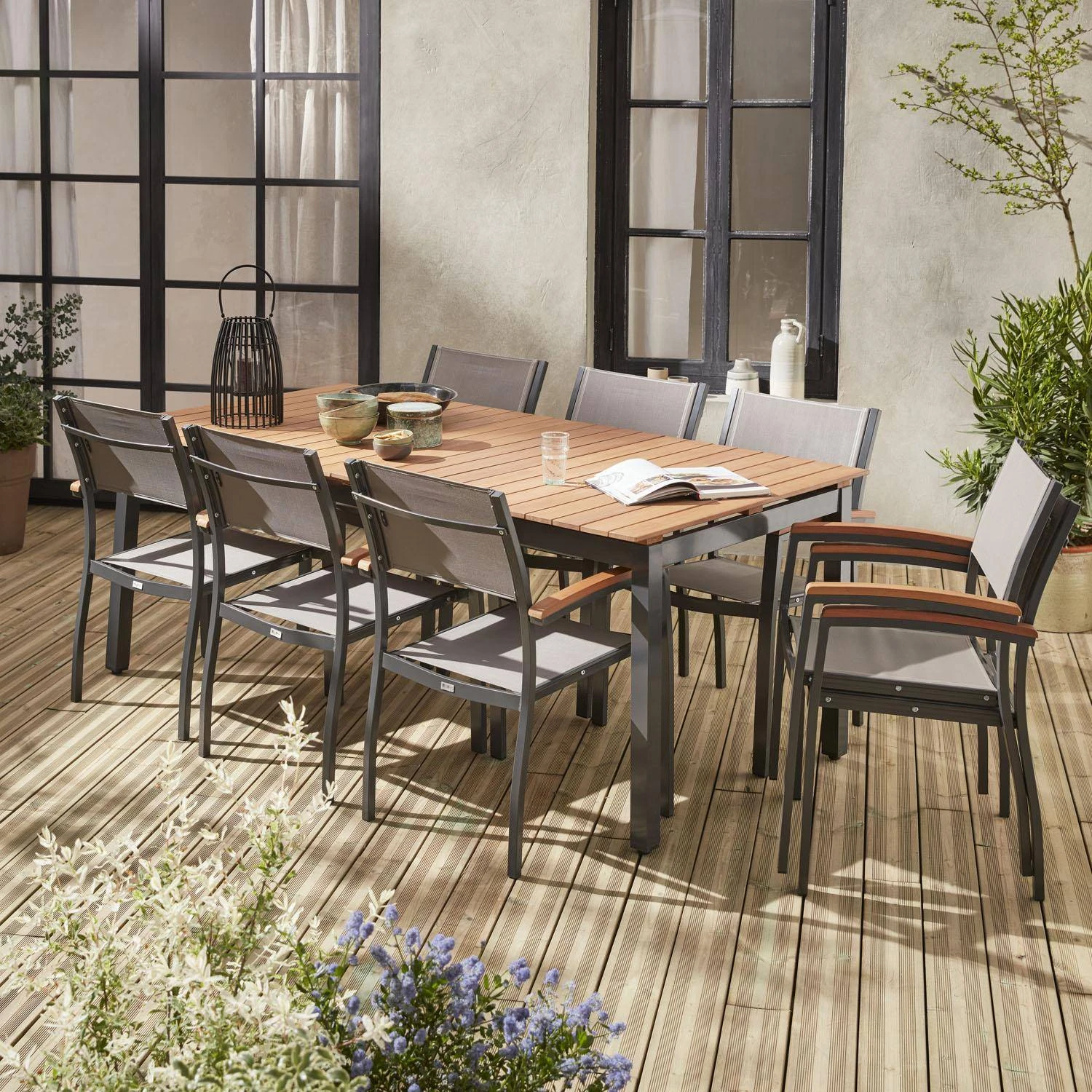 Avec un mix de bois, de textilène et d’aluminium, l’ensemble de jardin Sevilla est résolument contemporain. Chic et épuré, il trouve sa place facilement dans tous les environnements. Pratique, la table est extensible. Elle passe de 2m à 2,5m pour recevoir plus de convives. Pour ce faire, il suffit de tirer les extrémités de la table et de déplier la rallonge papillon intégrée. Lorsqu’elle est étendue, la table peut accueillir en son centre un parasol dont le diamètre de dépasse pas 50 mm. Il est impératif d’utiliser une base (non fournie) pour maintenir le parasol. Les fauteuils s’empilent et se rangent facilement.