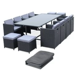 Conçu en résine tressée, le Vasto est très solide. En effet, ce matériau chic et moderne est pensé pour résister aux UV et aux intempéries (pluie, neige, eaux salées). Pour vous garantir longévité, la structure métallique de cet ensemble de jardin est en acier galvanisé recouvert d’une peinture thermolaquée. Ce traitement offre une plus grande protection contre l’oxydation de l’acier. Les coussins sont déhoussables et résistants à l’eau. De plus, ils sont munis d’un passe-poil ! Le plateau de la table est en verre trempé noir, 5mm d’épaisseur. C’est un verre 5 fois plus solide que le verre traditionnel.