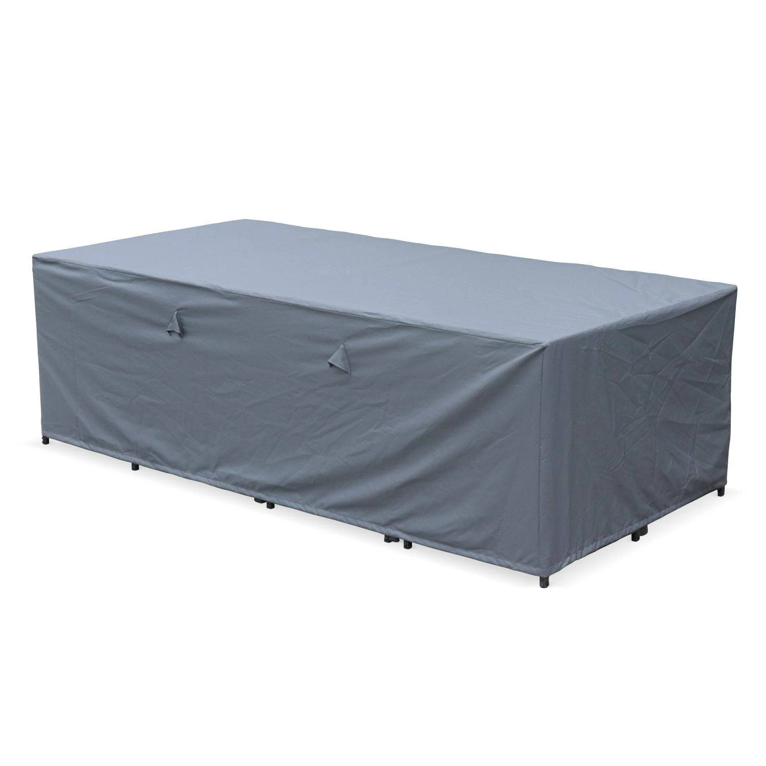 La housse fournie est en polyester avec un revêtement en polyamide. Déperlante et imperméable grâce à l’enduction PA, elle préserve votre ensemble de jardin de la pluie, de la poussière et du soleil. Cela évite l’usure et les dégradations liées aux intempéries. Pratique, cette housse traitée anti UV est dotée d’un cordon de serrage avec œillets intégrés. Ce cordon est inséré dans l’ourlet et il ressort dans les angles, cela permet de maintenir la housse sur le salon de jardin. Quatre aérateurs placés sur la housse empêchent la condensation. L’air libre circule également par le bas. Ainsi, les risques de moisissures sont évités.