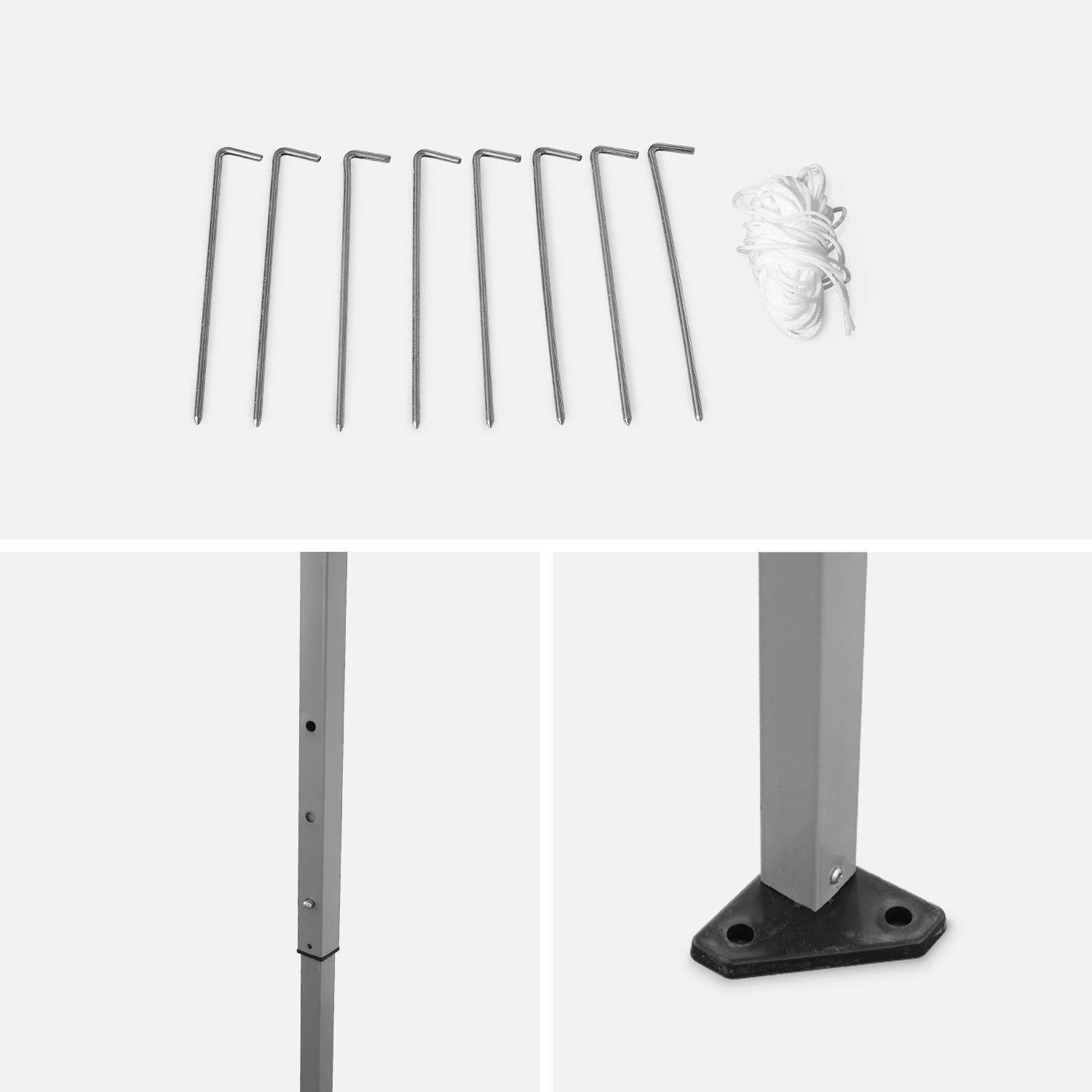 Cordes, sardines, et pieds pré-percés en plastique sont livrés avec la pergola pour la fixer au sol et assurer une bonne stabilité. Elle se range facilement dans son sac de transport à roulettes fourni.