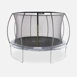 Le filet de sécurité, haut de 1,80m à partir du tapis de saut, sécurise l’utilisation et empêche les chutes hors du trampoline. Bien pensé, ce filet au maillage 6×6 millimètres est refermable avec des clips et une fermeture éclair. Cette dernière est jaune, pour vite repérer la sortie en cas d’urgence.